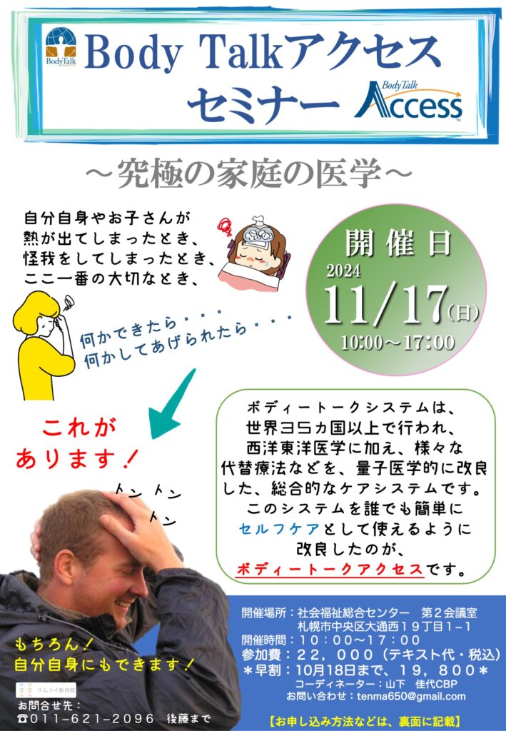 イベント/セミナー 11/17 ボディートークアクセスセミナー【札幌】 11月17日ボディートークアクセスセミナー【札幌】 次回の札幌でのボディートークアクセスセミナーの開催が決定いたしました。 セミナーの詳細はこちらから↓↓↓ボディートークアクセスセミナー